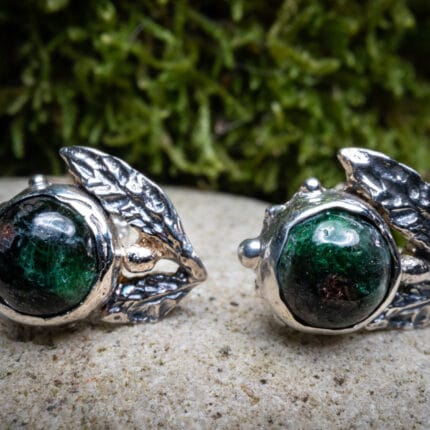 ⚜︎ Auskarai bei jų užsegimai sukurti iš 925 prabos sidabro, sidabras tamsintas.⚜ Auskarai inkrustuoti 5 mm diametro dydžio tamsiai žalios spalvos onikso akmenimis.⚜Kiekvieno auskaro lapeliai unikalūs bei skirtingi, formuoti rankomis.⚜ Prabuota Latvijos prabavimo rūmuose.⚜ Auskarų svoris 6,47 g.⚜ Papuošalas parduodamas supakuotas medinėje rankų darbo dėžutėje.