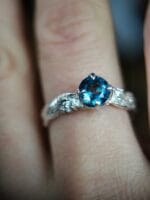 ⚜ Vienetinis gamtiško stiliaus sidabro žiedas.⚜ Žiedas su 5 mm dydžio mėlynos spalvos topazu. Šonuose įdėti 2 labaratoriniai moisonitai, kurių dydis 2,2 mm.⚜ Prabuota Latvijos prabavimo rūmuose, sidabro praba 925, žiedas sveria 2,6 g.⚜ Dydis 18.⚜ Papuošalas parduodamas supakuotas medinėje rankų darbo dėžutėje.