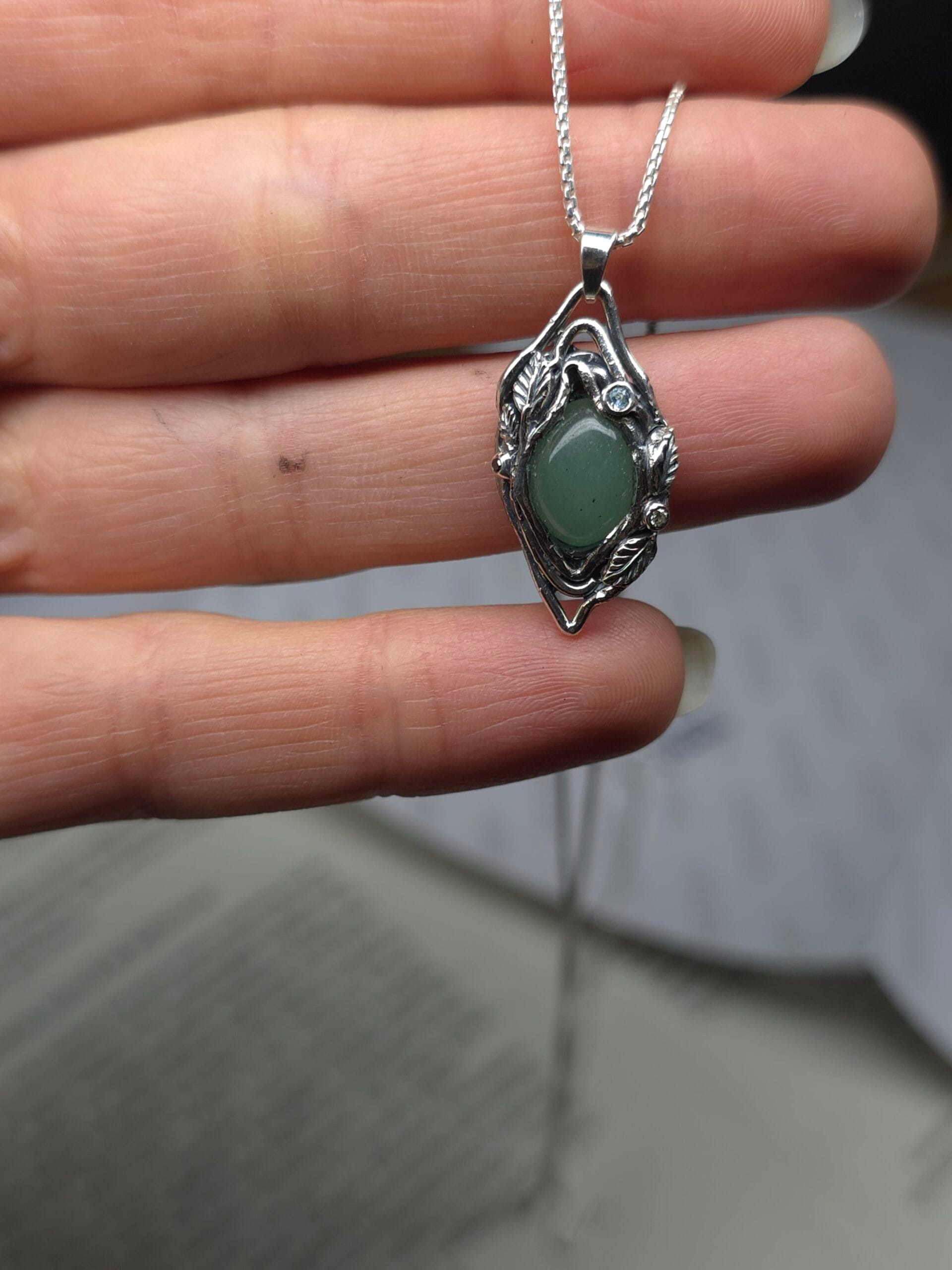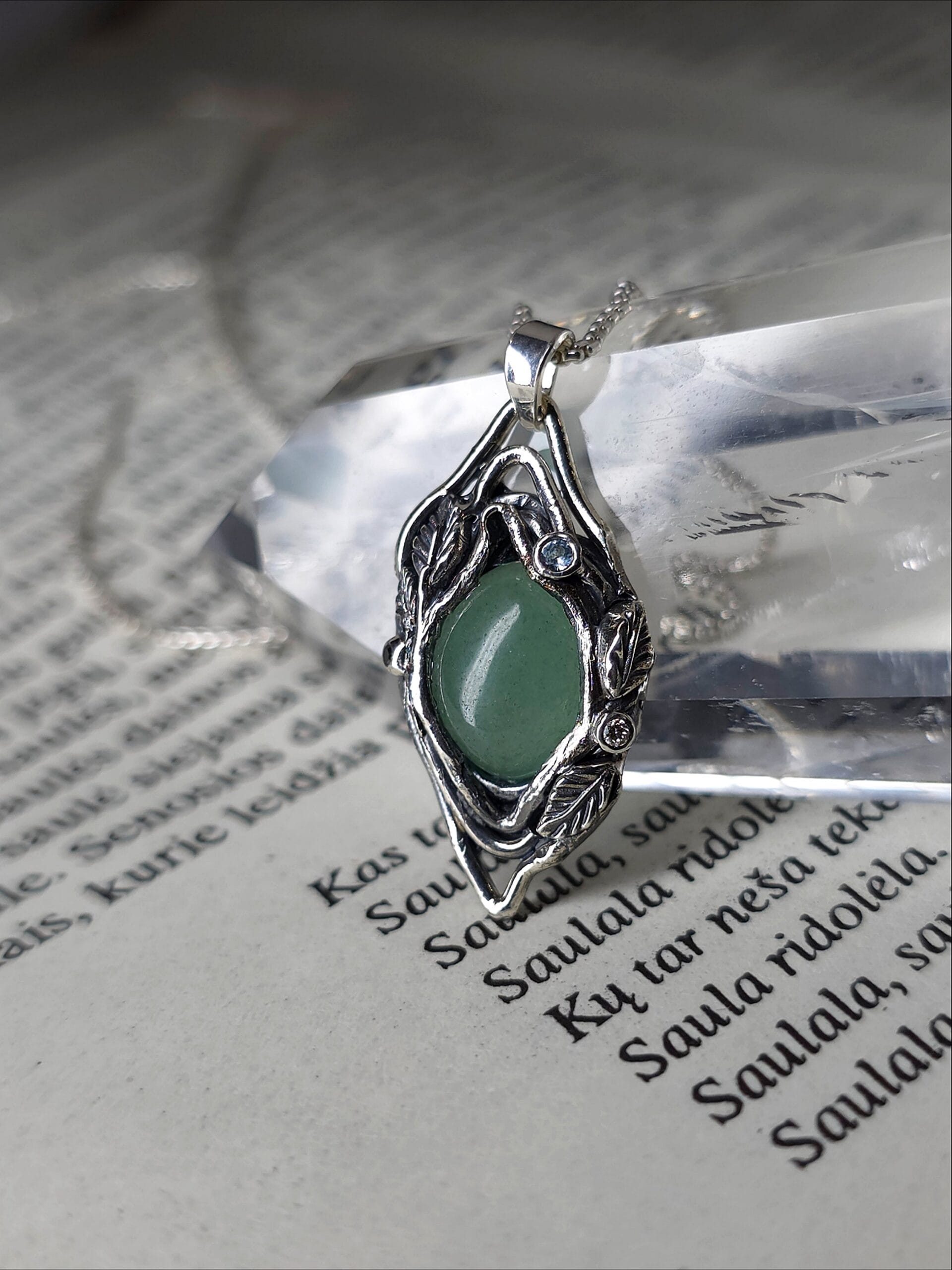 ⚜ Rankų darbo vienetinis tamsinto sidabro pakabukas. Centre – švelniai žaliu atspalviu švytintis natūralus agato akmuo, apsuptas organiškų sidabro linijų.