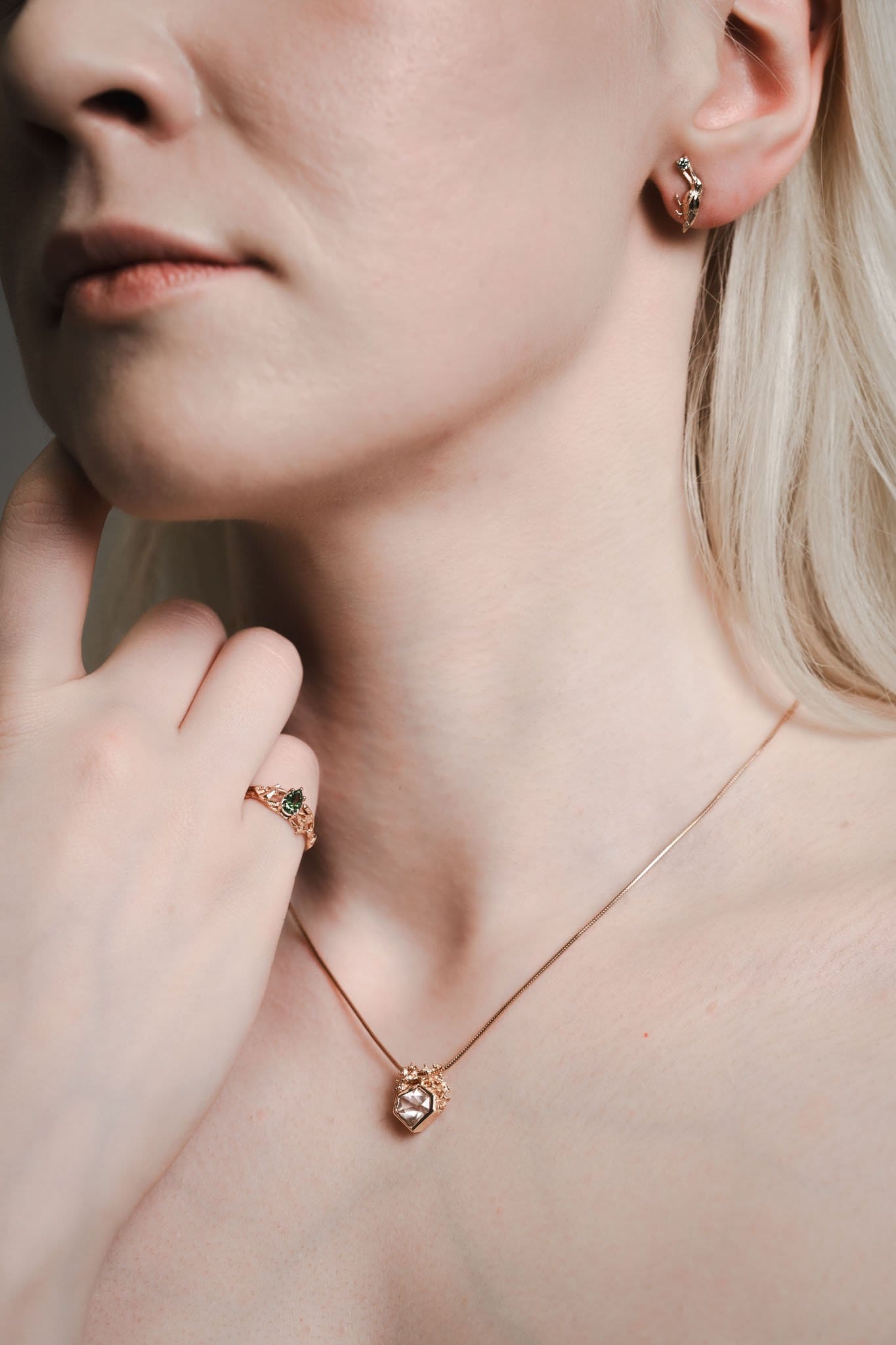 ⚜︎ 585 prabos rausvo aukso pakabukas su grandinėle, kuriame geometrinis Berckwerk šlifavimo rožinio kvarco akmuo susilieja su organiškomis gamtos formomis.