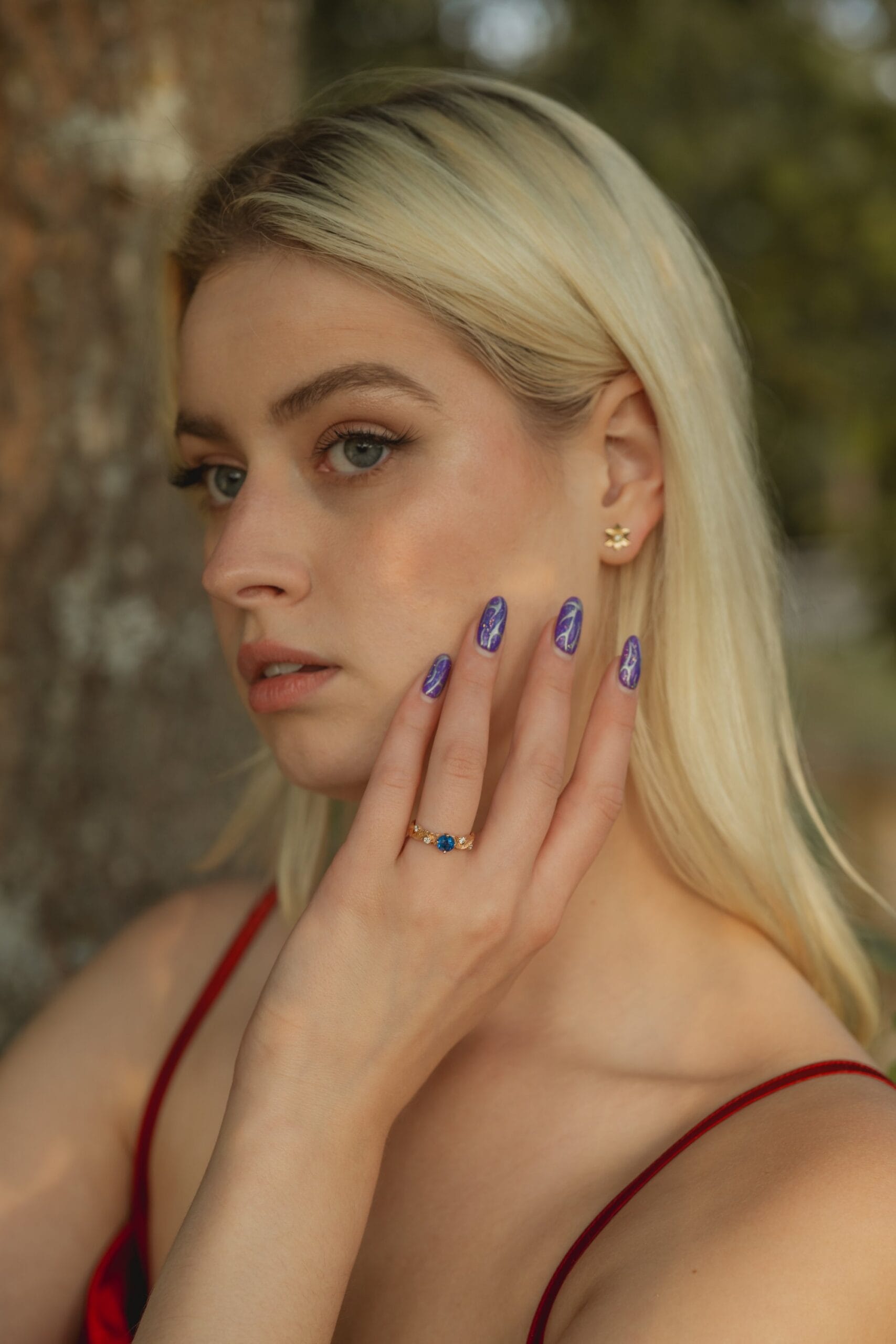 ⚜ Žiedas su centriniu 0,9 ct dydžio mėlynos spalvos safyru ir keturiais šoniniais natūraliais briliantais, kurių bendras svoris 0,10 ct. Brangakmenių autentiškumas patvirtintas prabavimo rūmų etiketėje, akmenų specifikacijos parašytos paskutinėje nuotraukoje.