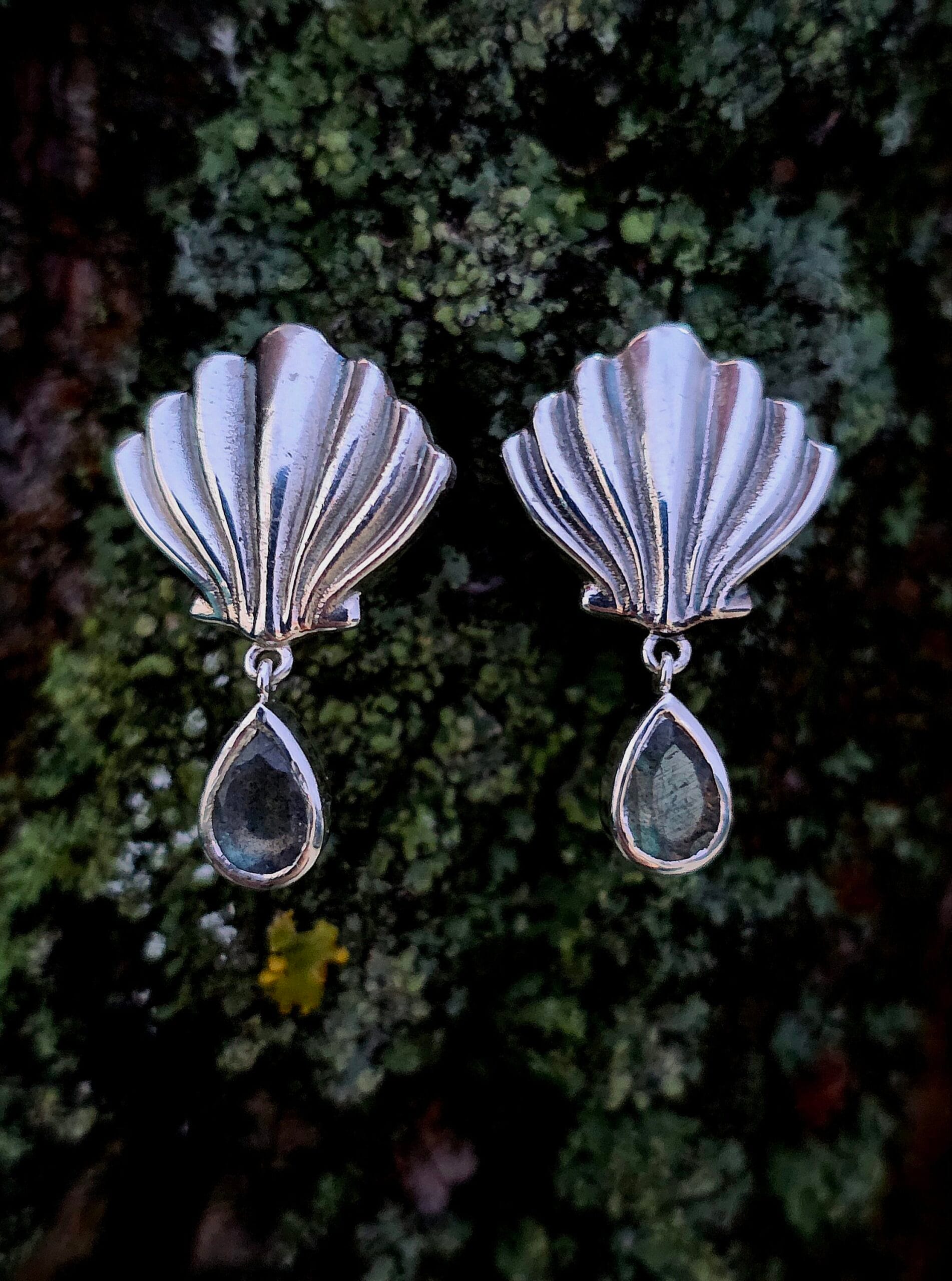 ⚜︎ Sidabriniai auskarai, įkvėpti jūros. Kriauklės formos viršus ir melsvai švytintys labradoritai primena vandens šviesos žaismą jūros gelmėje.