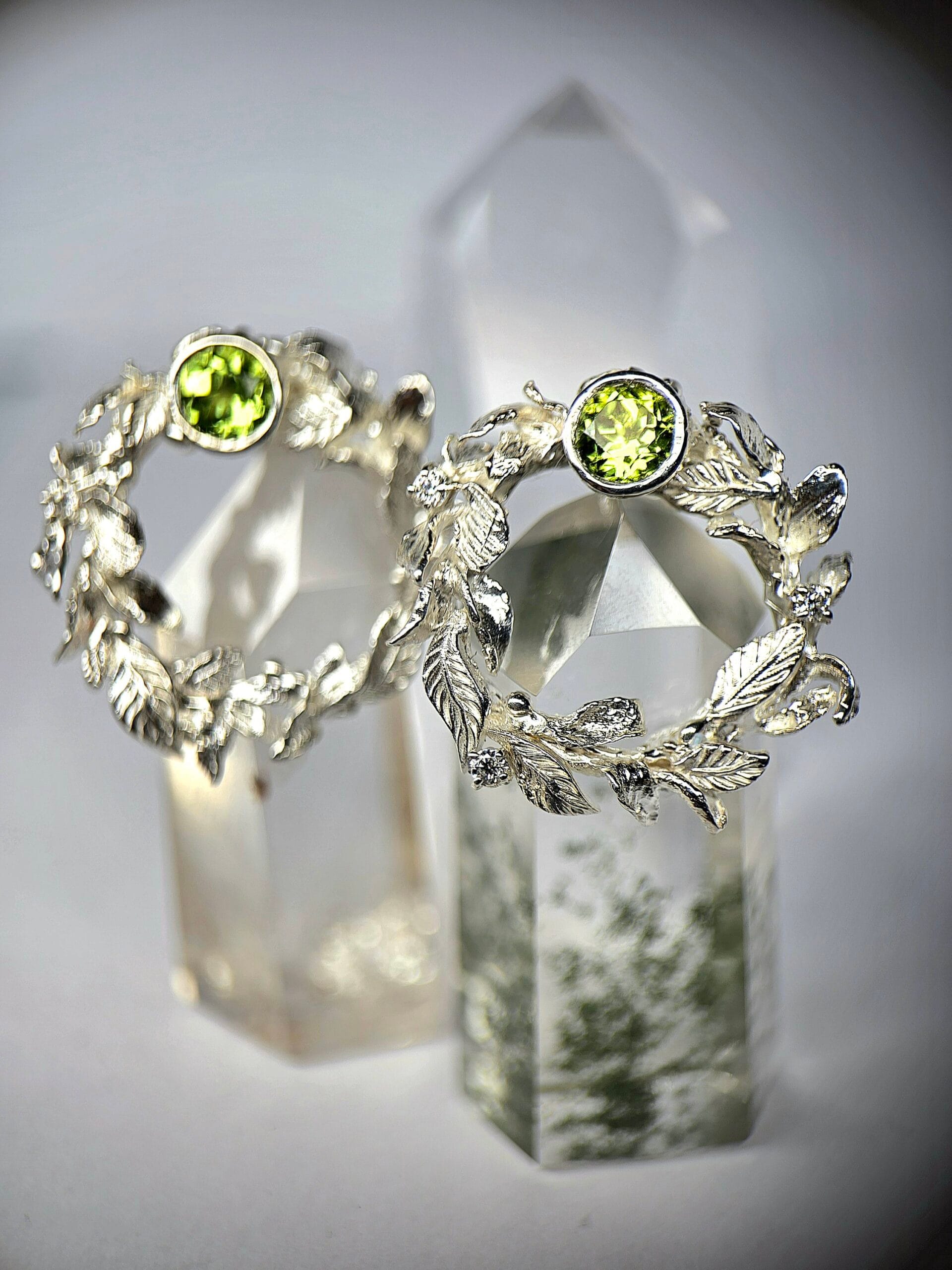 ⚜︎ Centre – du žali peridotai, šonuose, tarp lapelių yra įdėti 6 nedideli moisonitai.