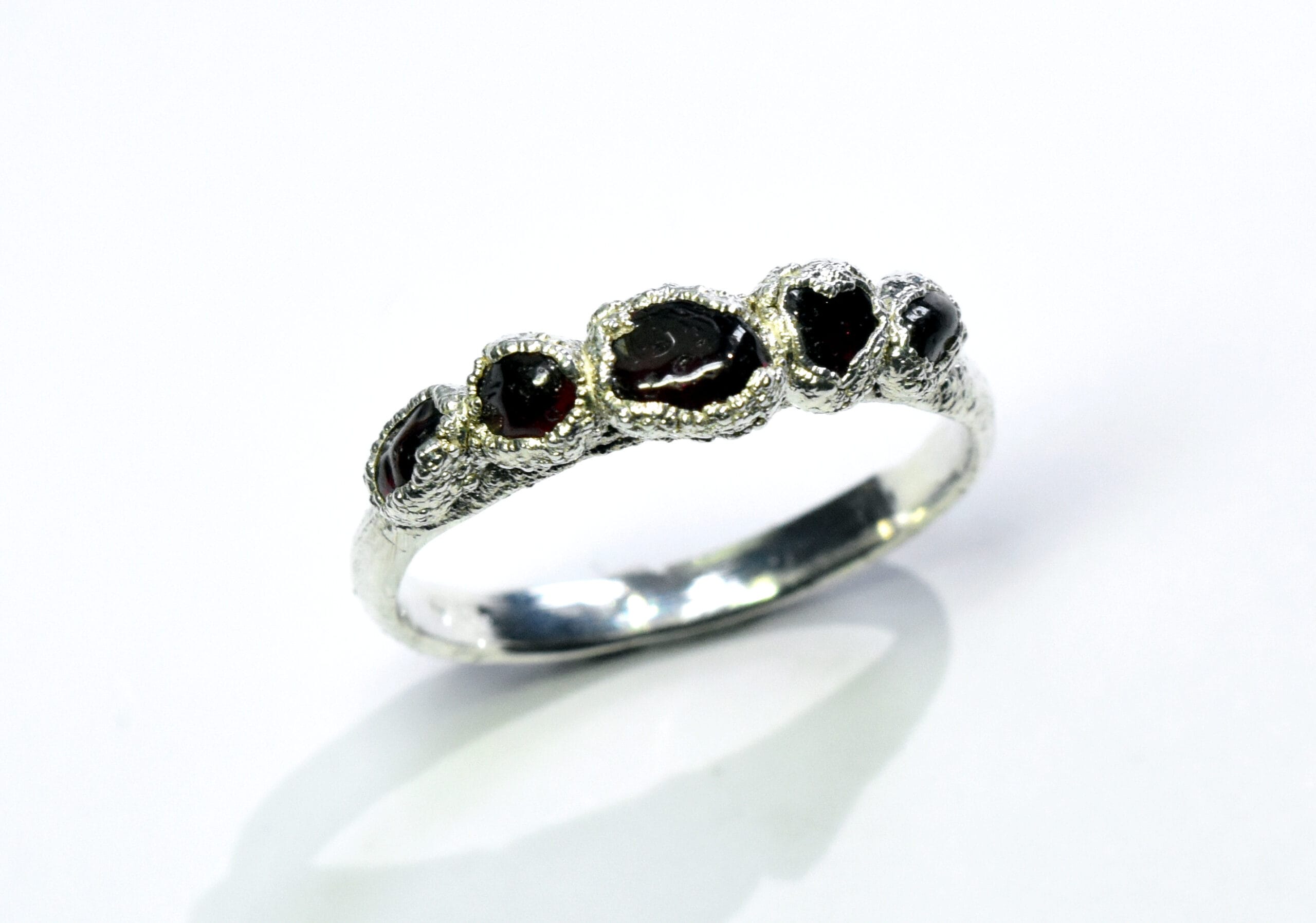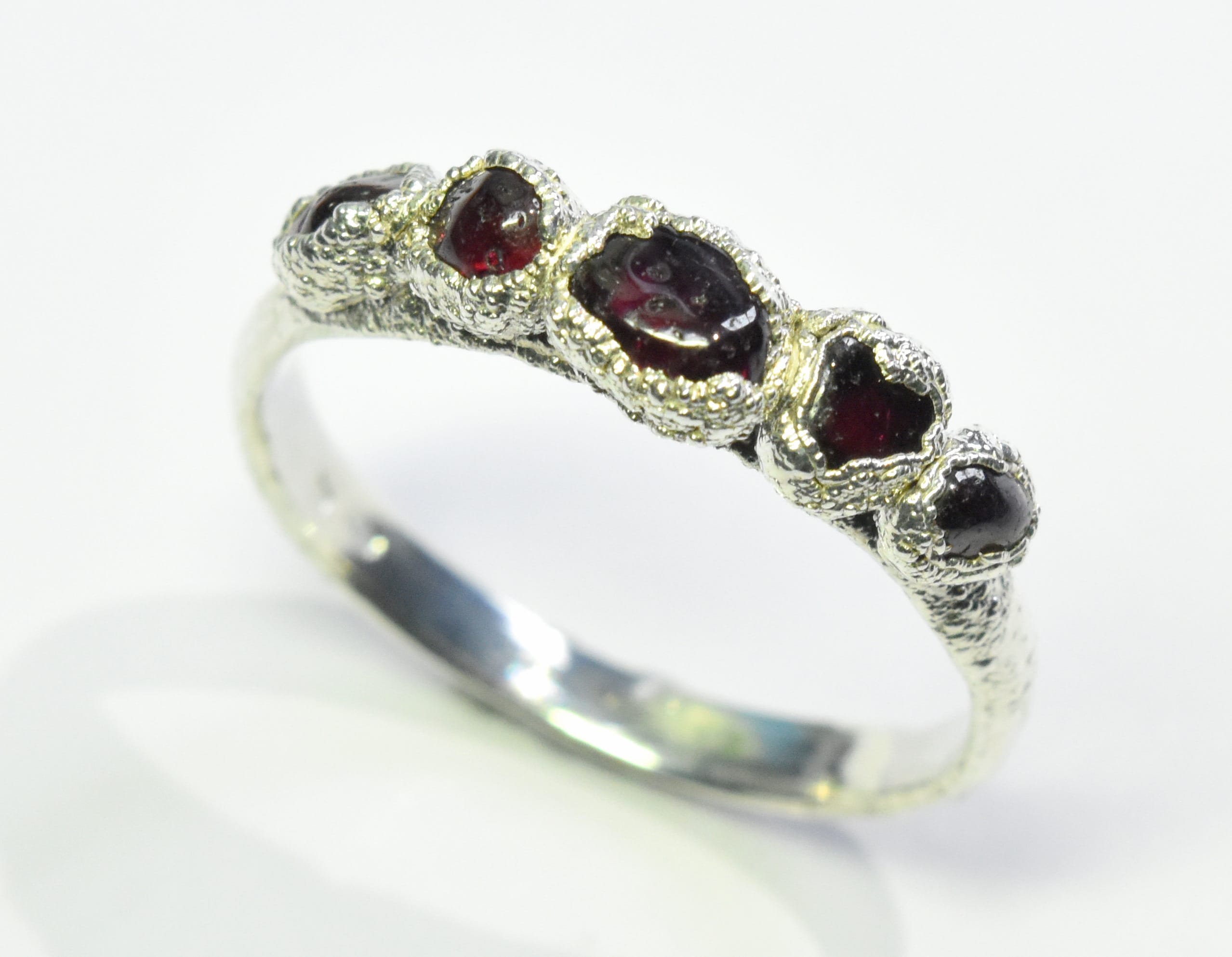 ⚜︎ Vienetinis sidabro žiedas su smulkiais, natūraliais, neapdirbtais granato akmenimis.⚜︎ Sukurta iš 925 ir 999 prabos sidabro, sveria 2,97 g.⚜︎ Žiedo dydis 19,5 ( esant poreikiui gali būti šiek tiek didinamas).⚜︎ Prabuota Latvijos prabavimo rūmuose.⚜ Papuošalas atkeliauja supakuotas medinėje rankų darbo dovanų dėžutėje.