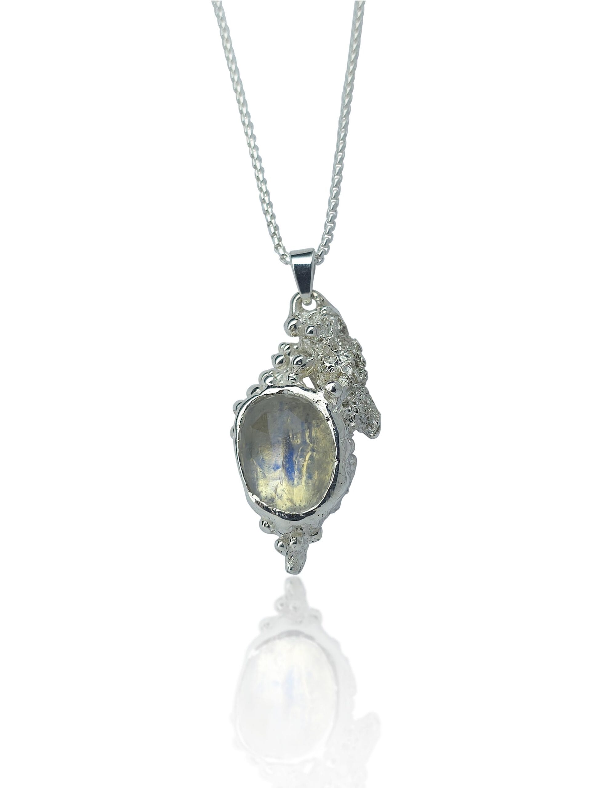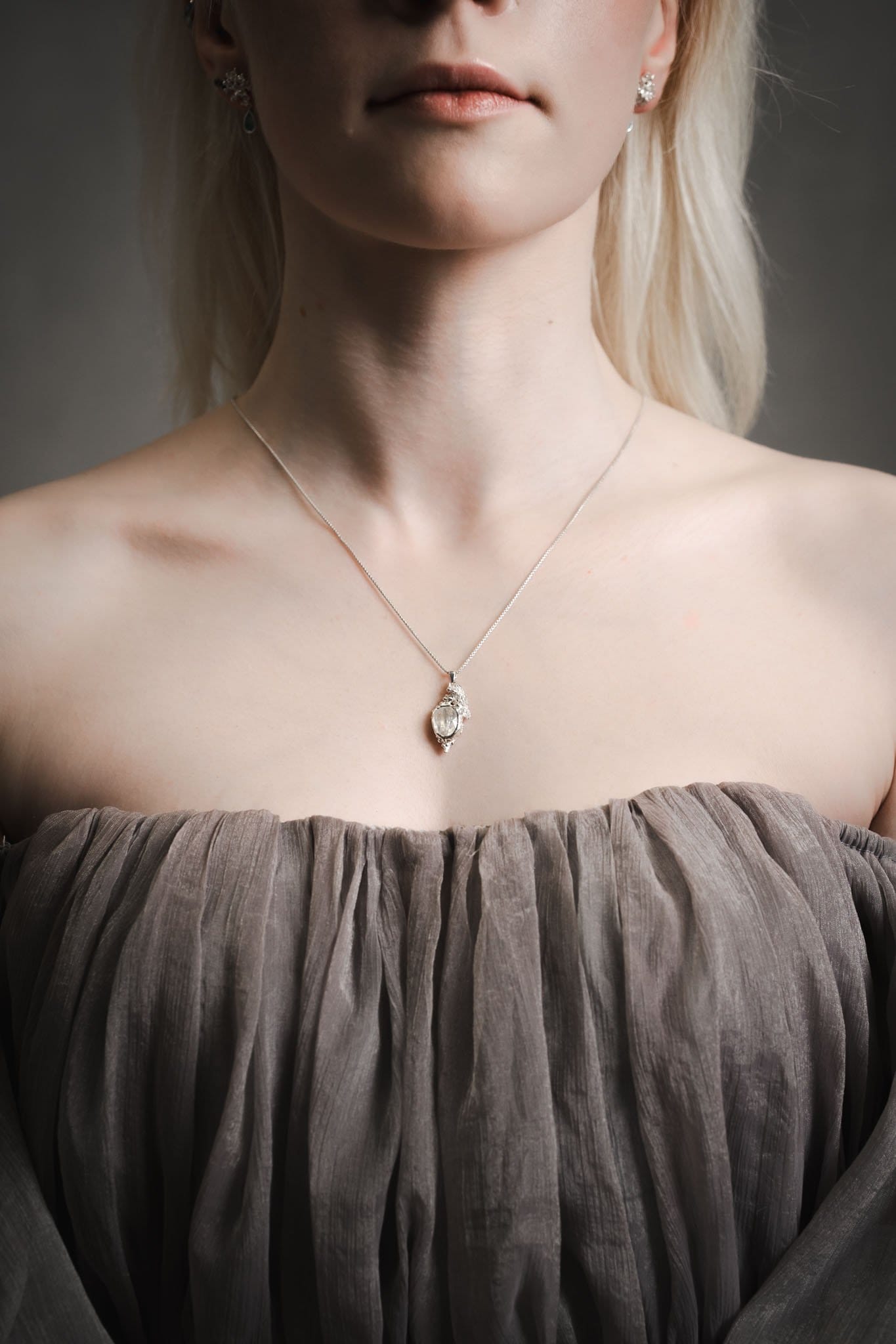 ⚜︎ Vienetinis sidabrinis pakabukas su natūraliu mėnulio akmeniu – mineralu, kuris švelniai skleidžia mėlynos šviesos žaismą, primenantį ramų nakties dangų. Kiekvienas kampas švelniai atspindi šviesą, todėl pakabukas atrodo tarsi gyvas.