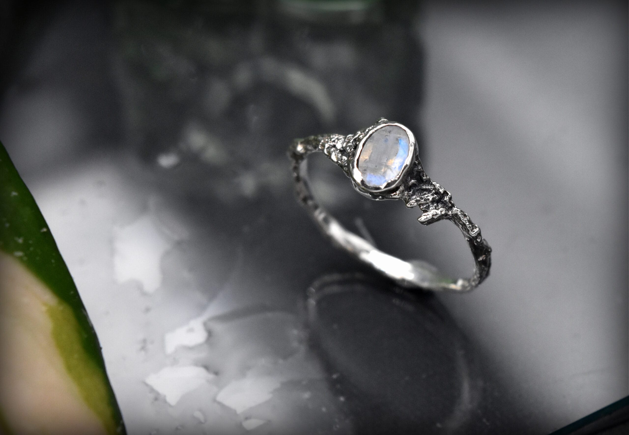 ⚜ Smulkus sidabro žiedas su natūraliu mėnulio akmeniu.⚜ Šio minimalistinio žiedo dizainas primena spygliuočio augalo šakelę.⚜ Prabuota Lietuvos prabavimo rūmuose.⚜ Papuošalas atkeliauja supakuotas dovanų dėžutėje.