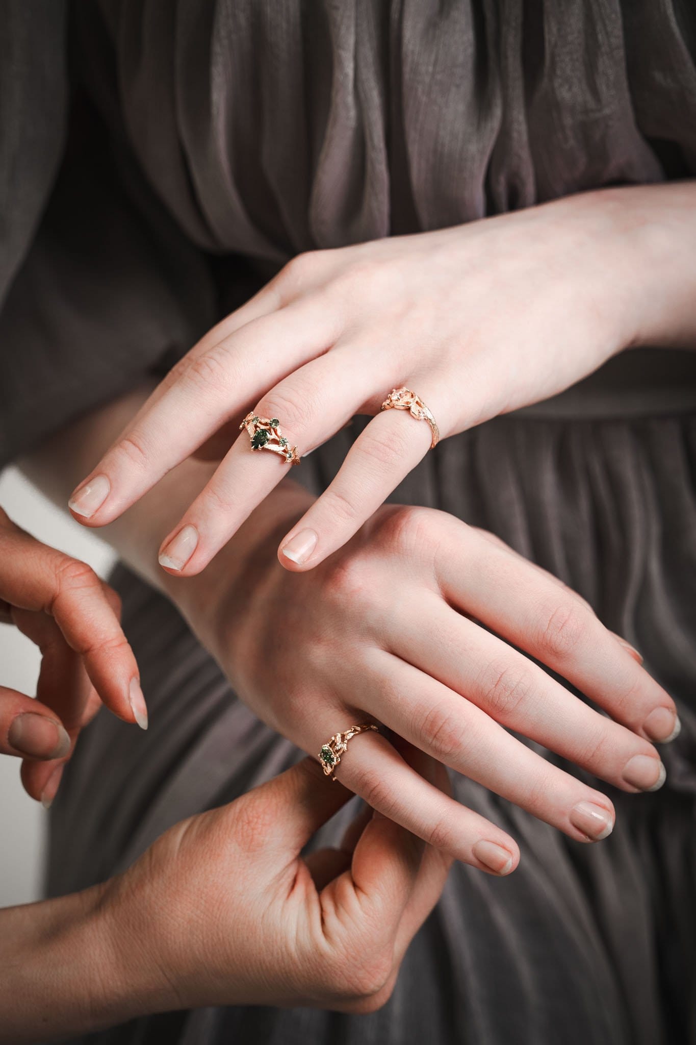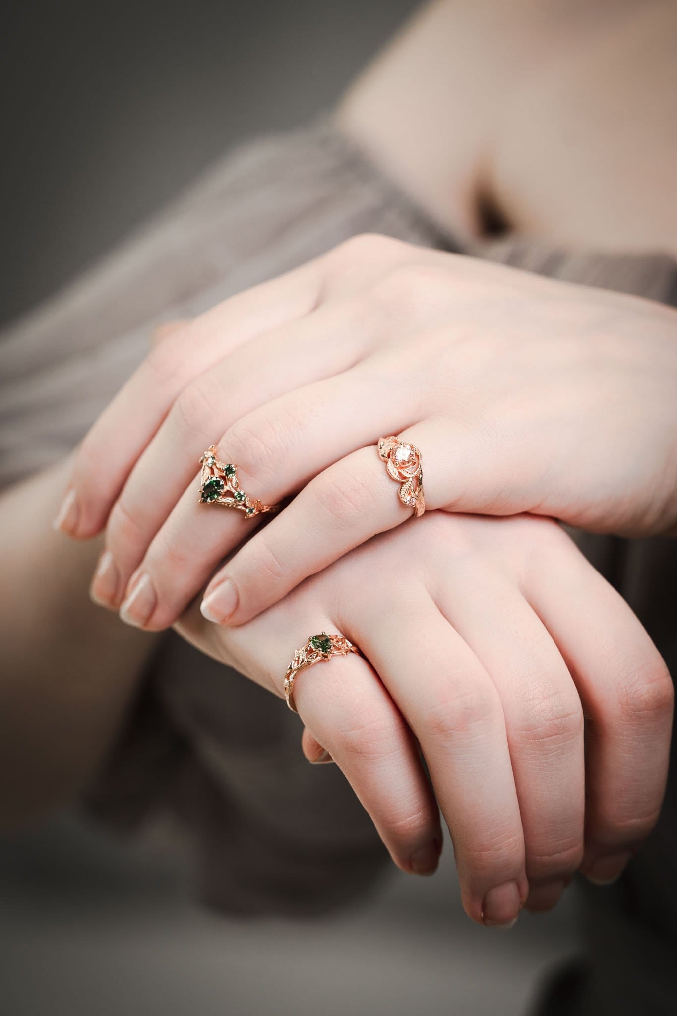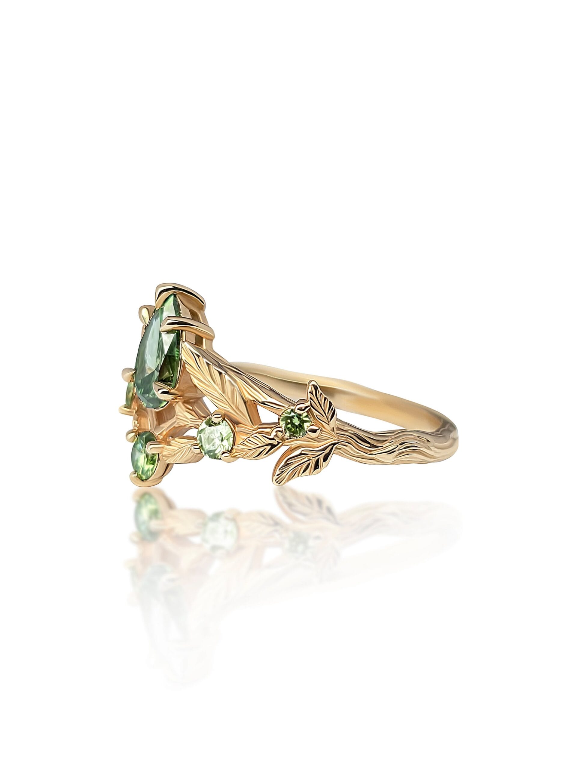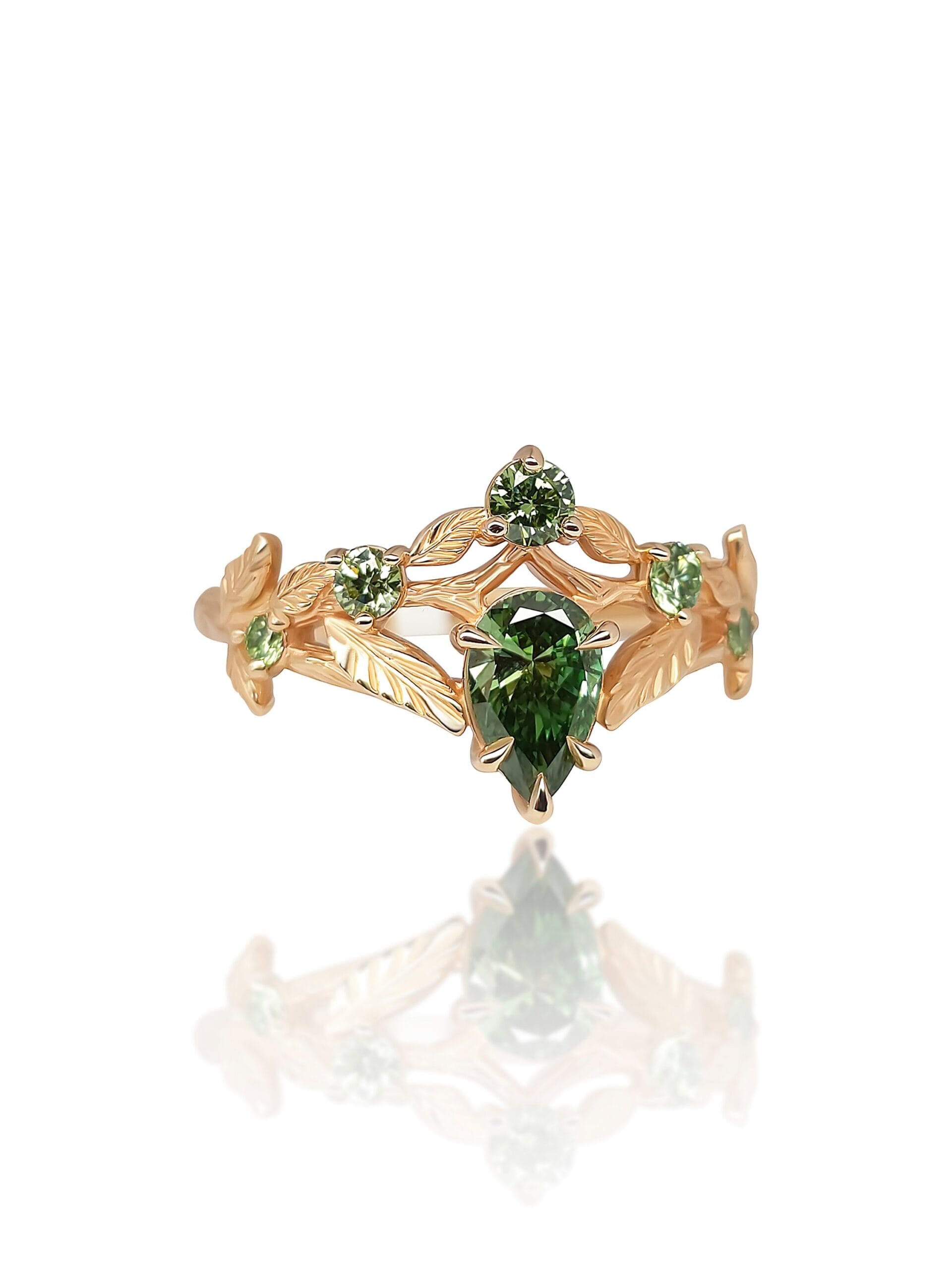 ⚜︎ Išskirtinis 585 prabos rasusvo aukso žiedas, sukurtas tarsi miško karūna – subtilūs lapų motyvai apsupa žaižaruojančius žalsvus deimantus ir kuria organišką, gyvą kompoziciją.