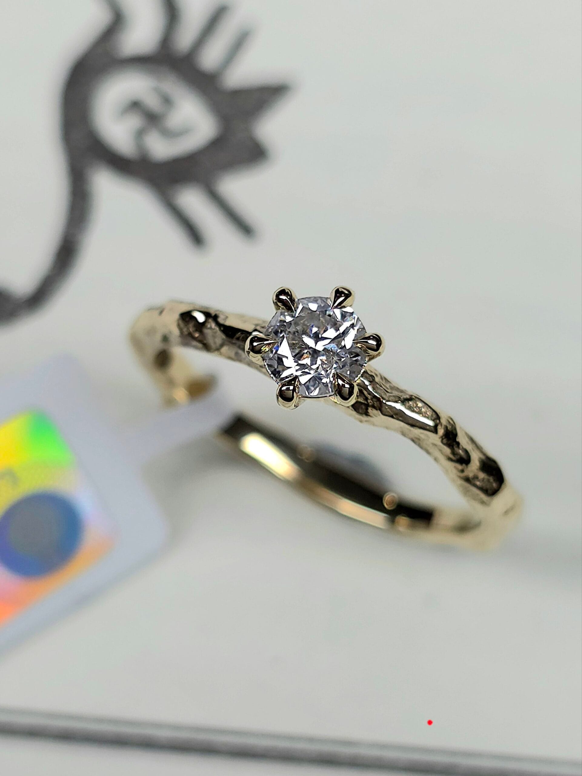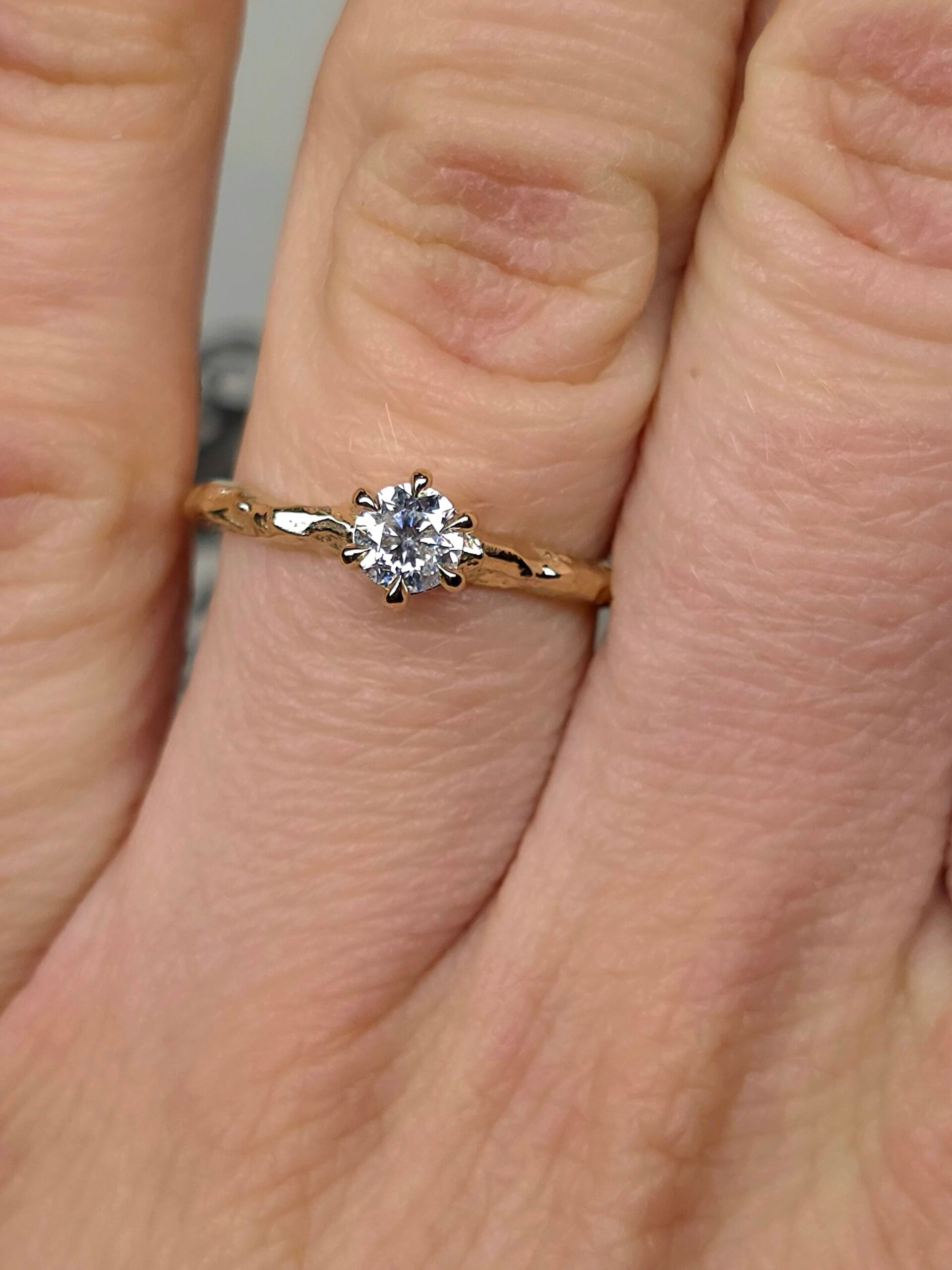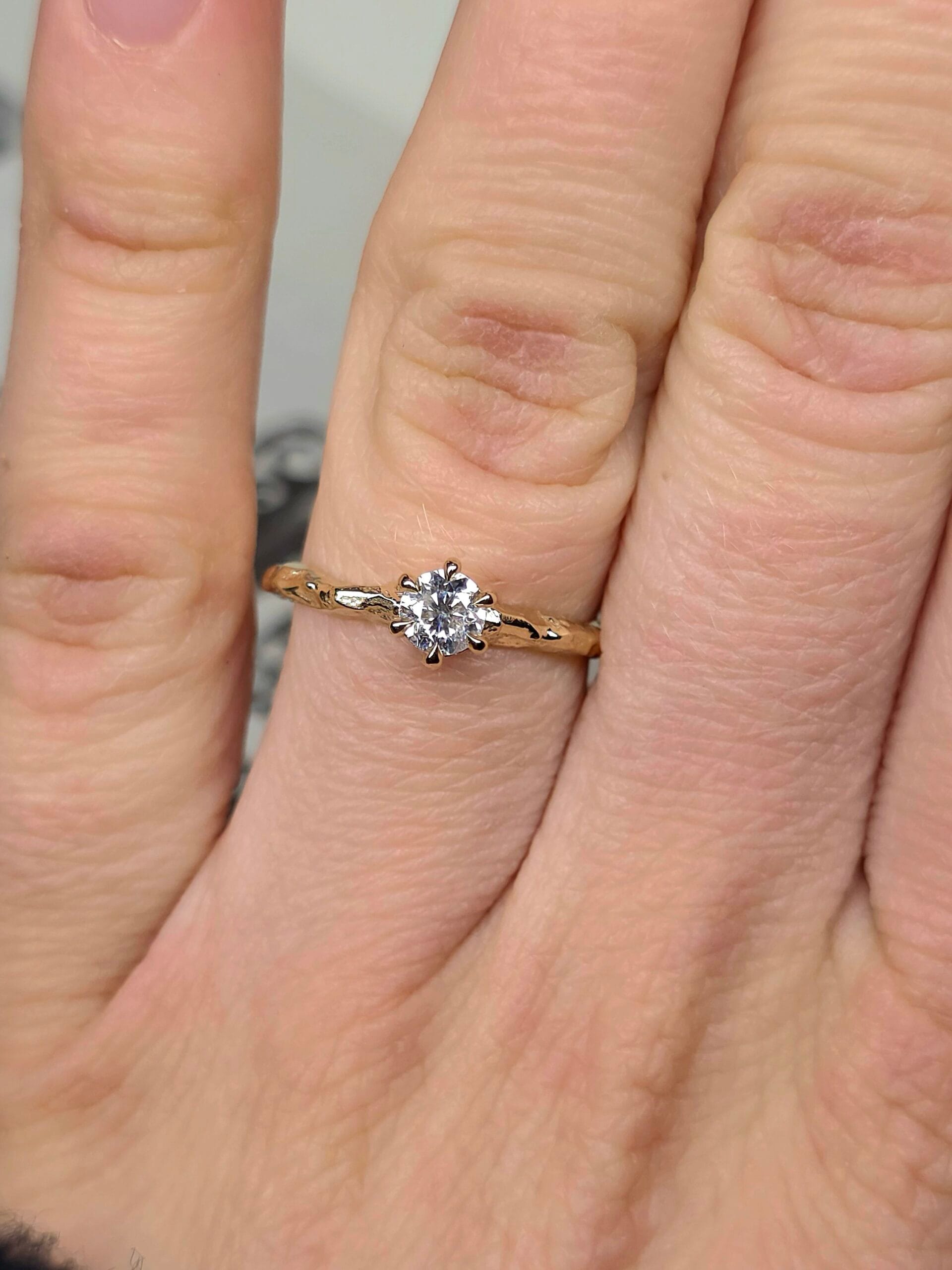 ⚜ Rankų darbo vienetinis auksinis žiedas su deimantu ir subtilia, medžio šakelę primenančia tekstūra.
