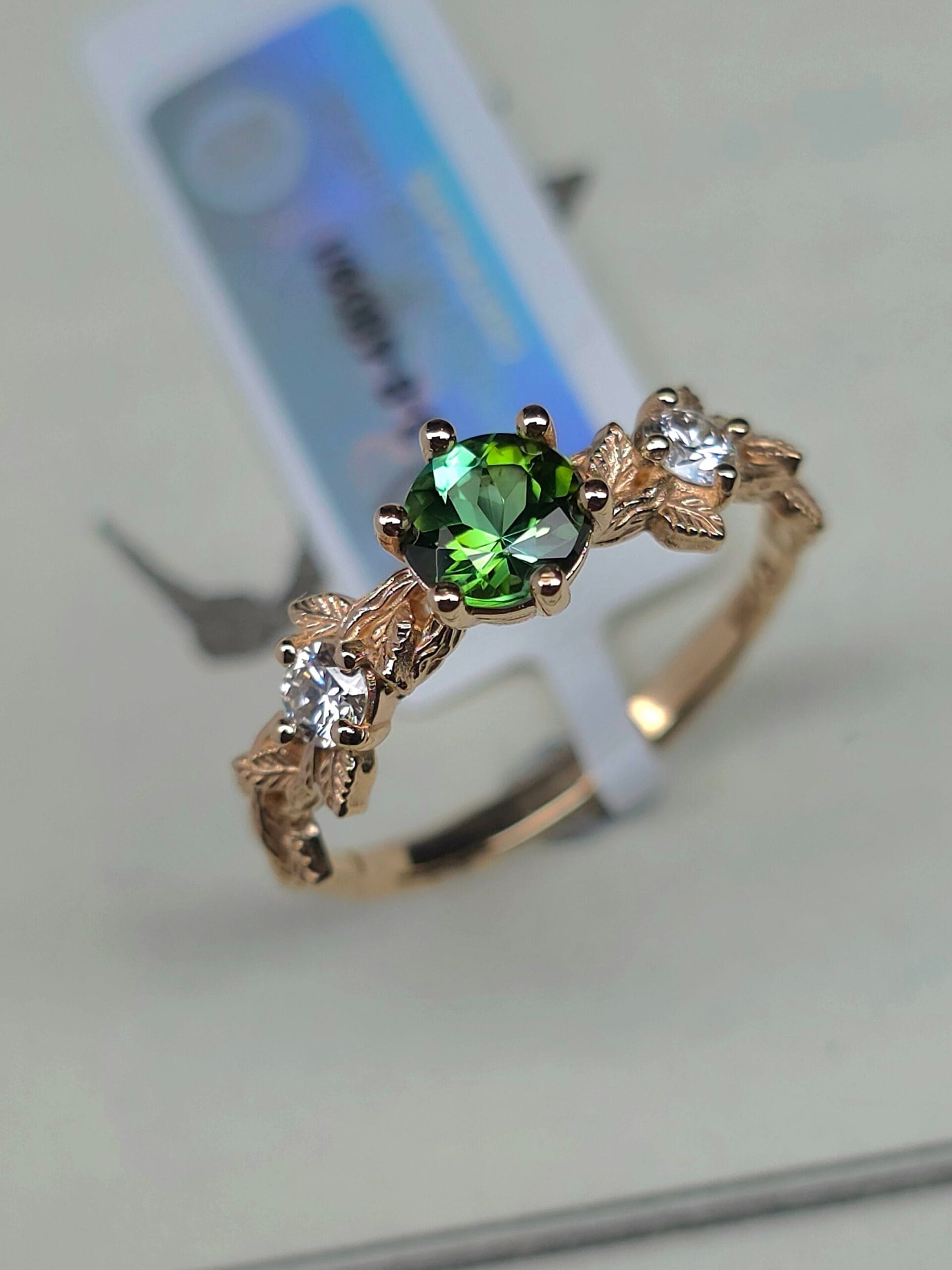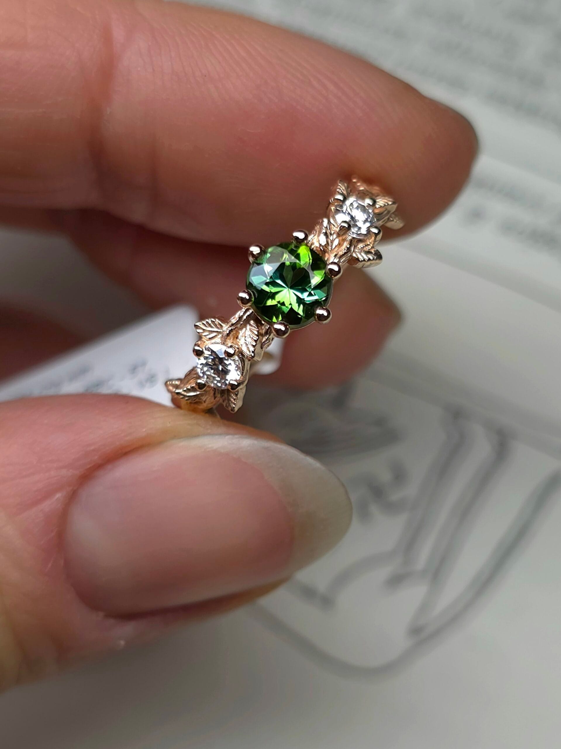 ⚜ Rankų darbo vienetinis auksinis žiedas su natūraliu žaliu dvispalviu turmalinu, laboratoriniais deimantais ir botaniniais motyvais.